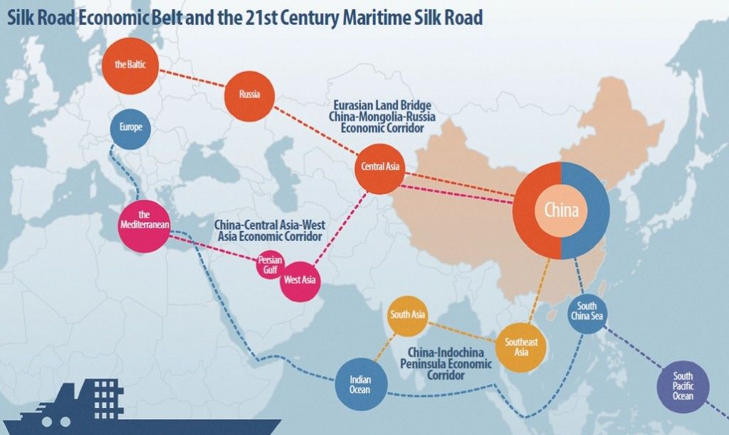 战略新丝绸之路(New Silk Road) ,前身为“ 一带一路”(OBOR),现为“一带一路”倡议(BRI) ,是中国政府发起的旨在发展互联互通基础设施的网络经济体系. 中国与其他国家的贸易市场 在亚洲和欧洲 通过改善运输和物流的连通性 国民总收入约占世界国民收入的50%。